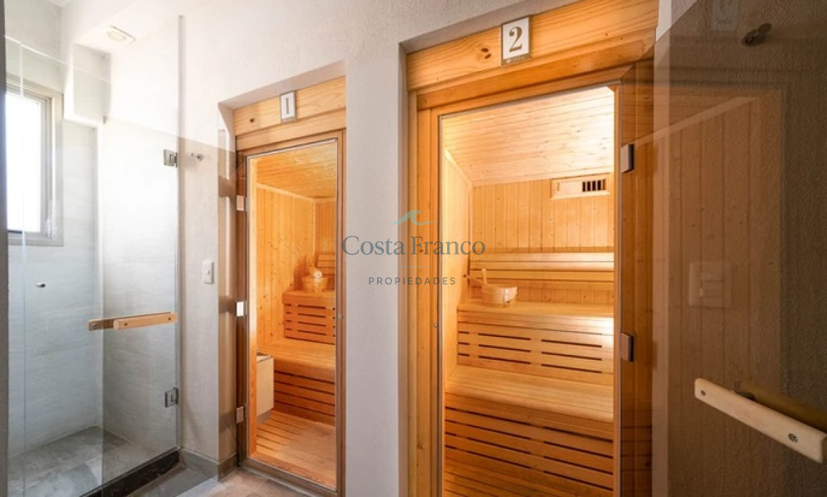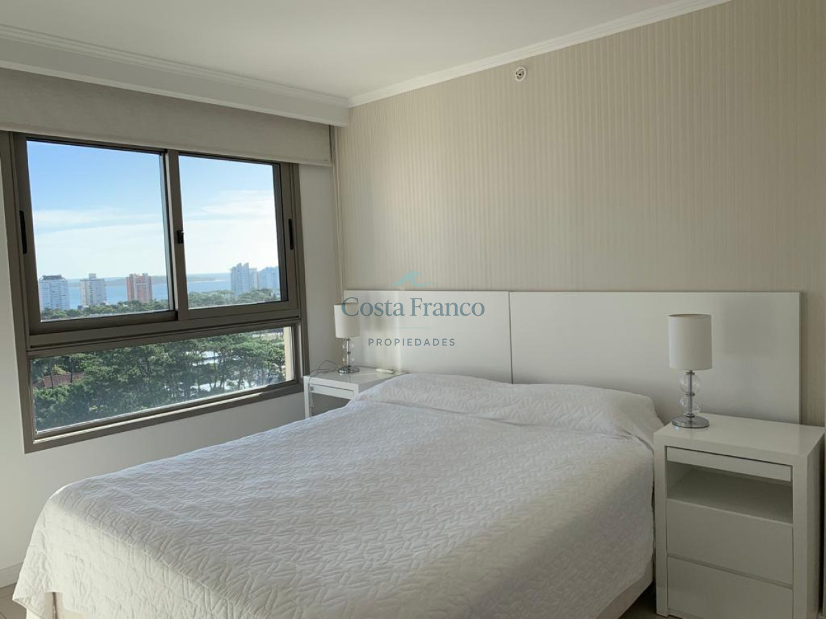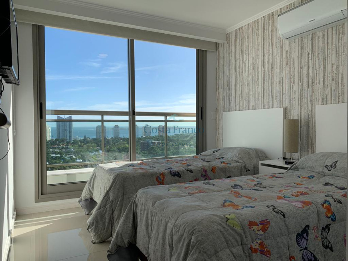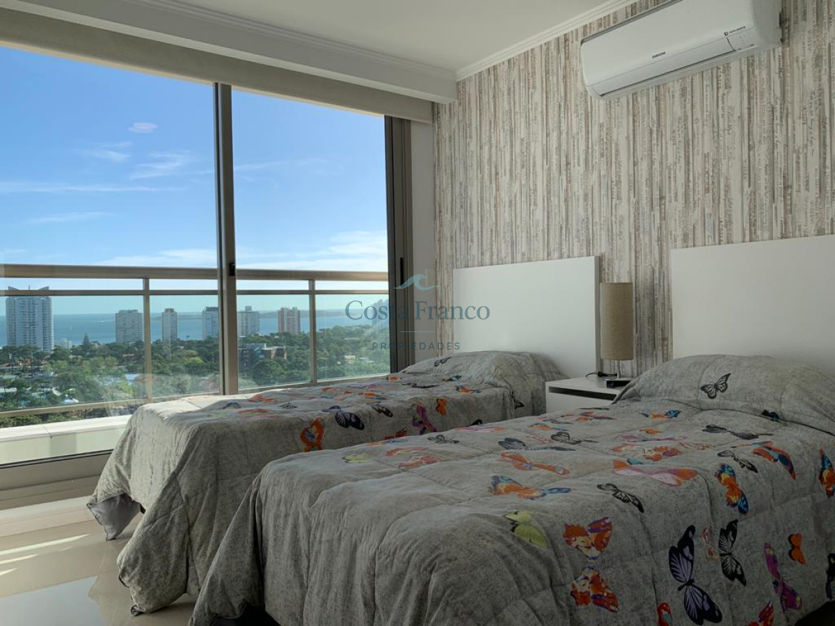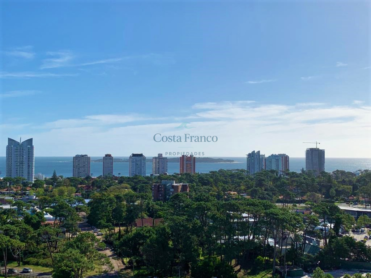 Cuenta con living comedor con grandes ventanales que permiten el ingreso de luz natural, salida al balcón mirando al mar y bosque. Cocina definida, bien equipada, con área de lavadero. Dos cómodos dormitorios con muy buena vista, que reciben el sol de la tarde, dos baños completos el principal en suite. Aire acondicionado en todos los ambientes. Garage.