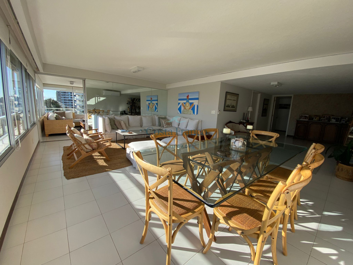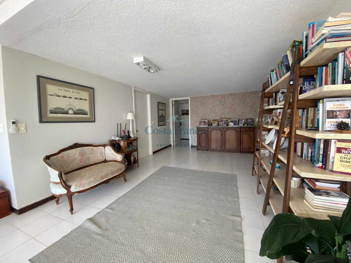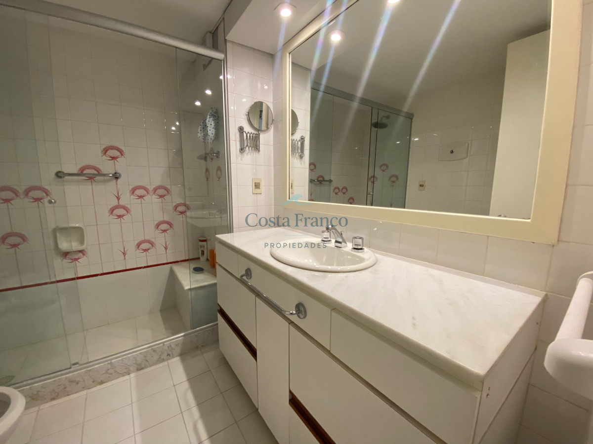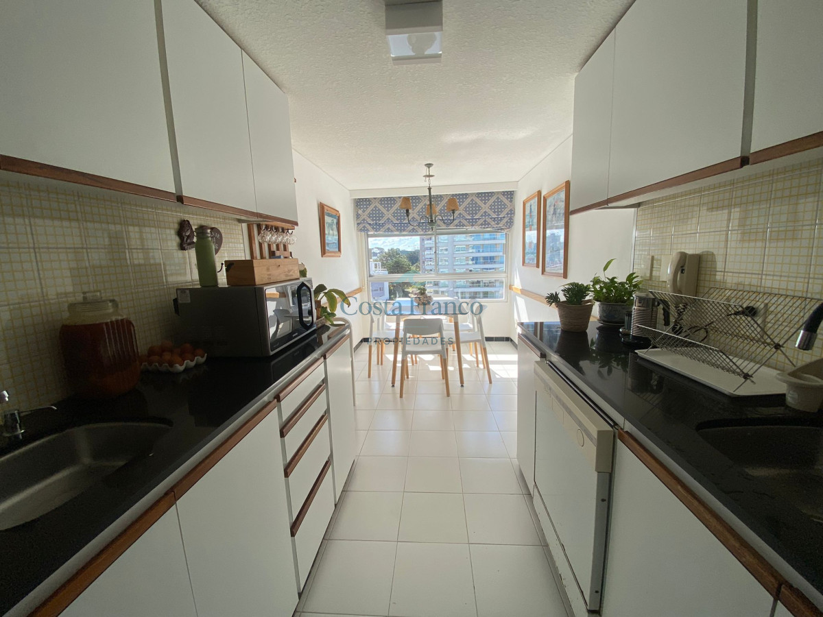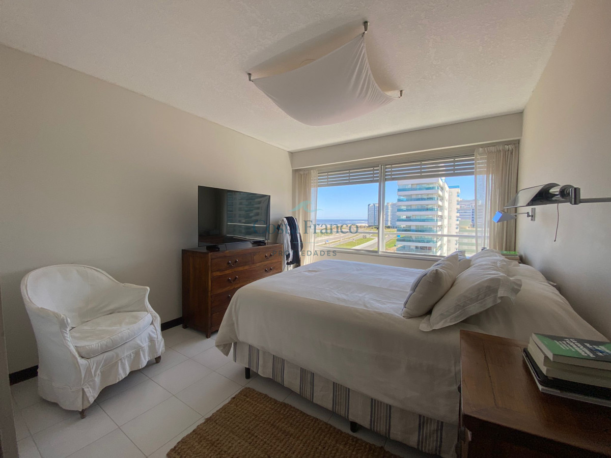 Amplio apartamento en edificio de categoría del Arquitecto Mario Roberto Álvarez; living-comedor con vista al mar, sala de estar, 3 dormitorios, 1 en suite con vestidor y vista al mar, 2 baños completos, cocina grande con vista al mar, con desayunador y office, dependencias de servicio con baño y lavadero independiente, doble acceso, principal y de servicio. Cochera. Muy luminoso