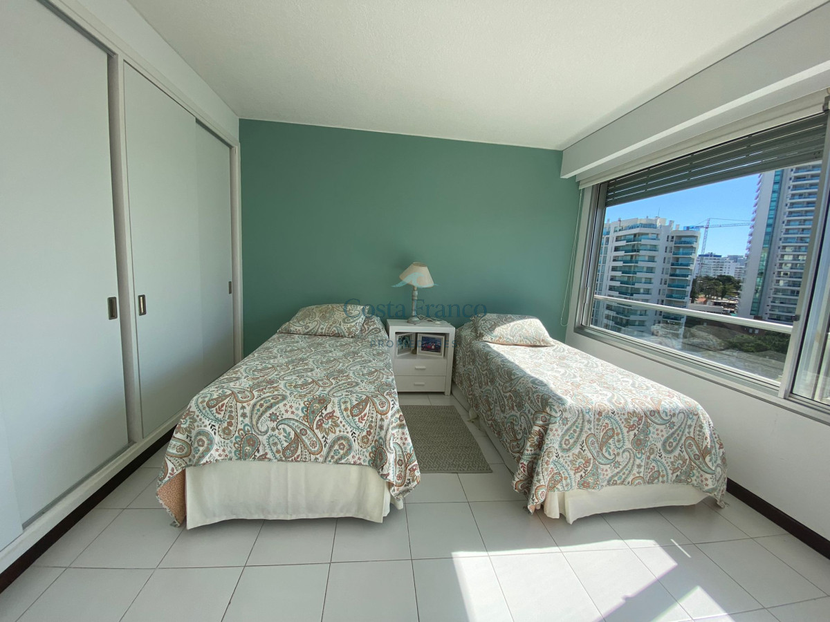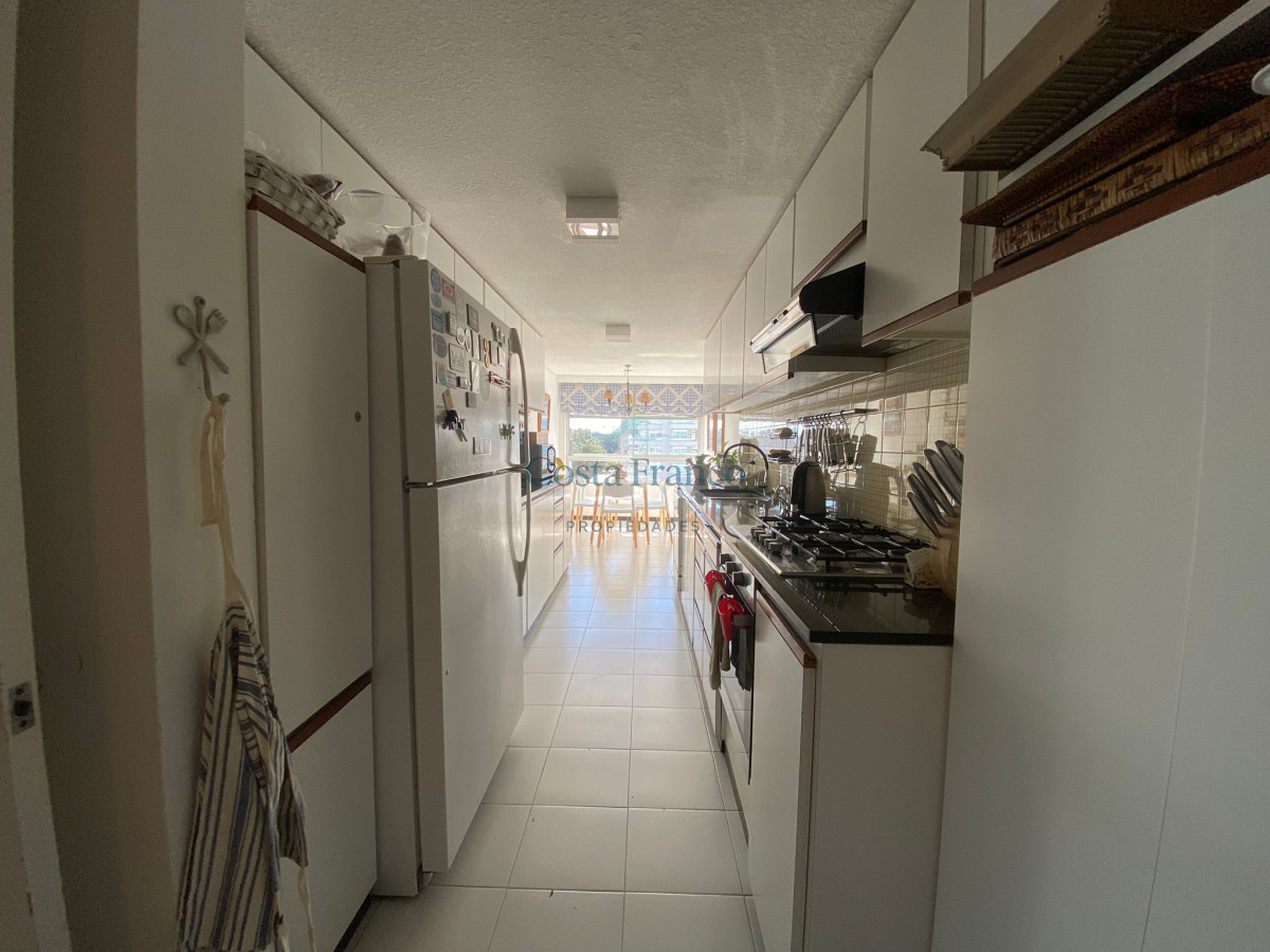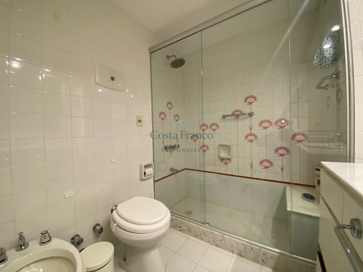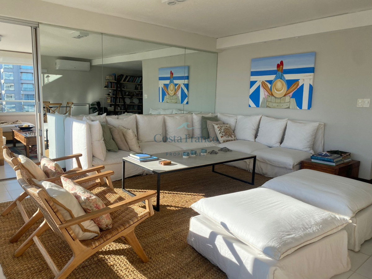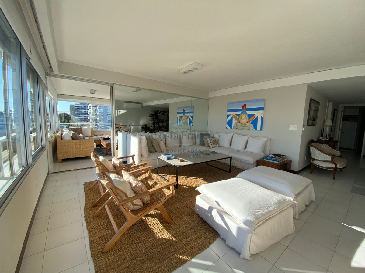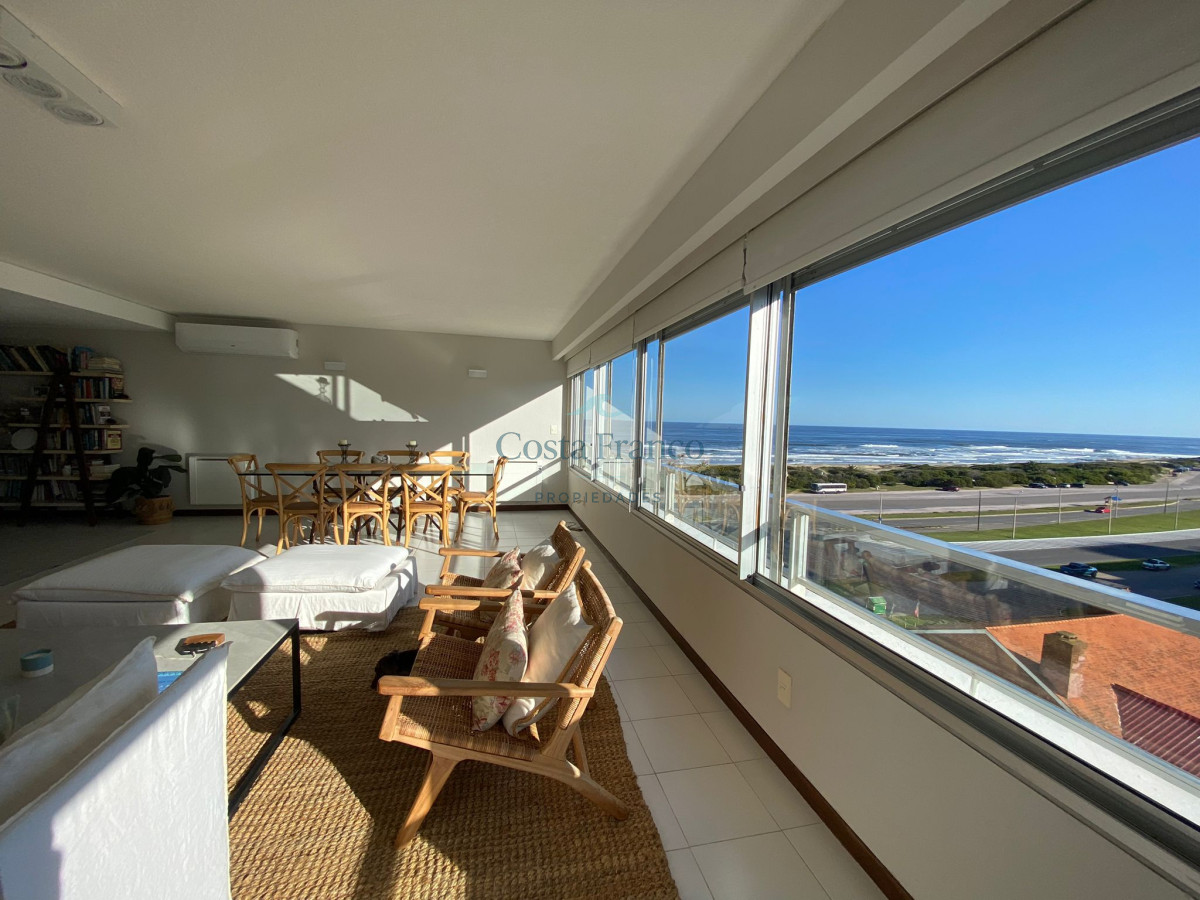 Amplio apartamento en edificio de categoría del Arquitecto Mario Roberto Álvarez; living-comedor con vista al mar, sala de estar, 3 dormitorios, 1 en suite con vestidor y vista al mar, 2 baños completos, cocina grande con vista al mar, con desayunador y office, dependencias de servicio con baño y lavadero independiente, doble acceso, principal y de servicio. Cochera. Muy luminoso