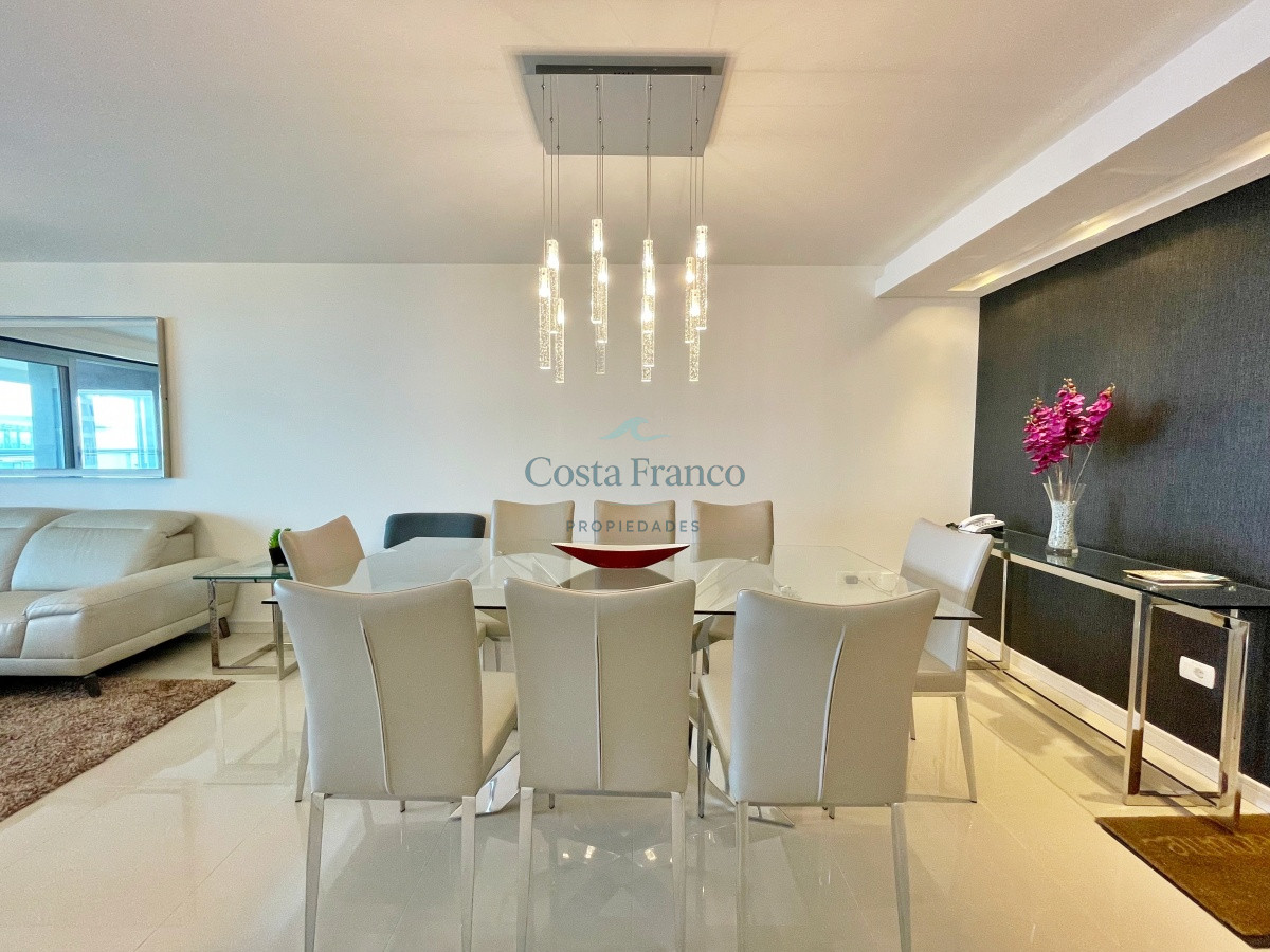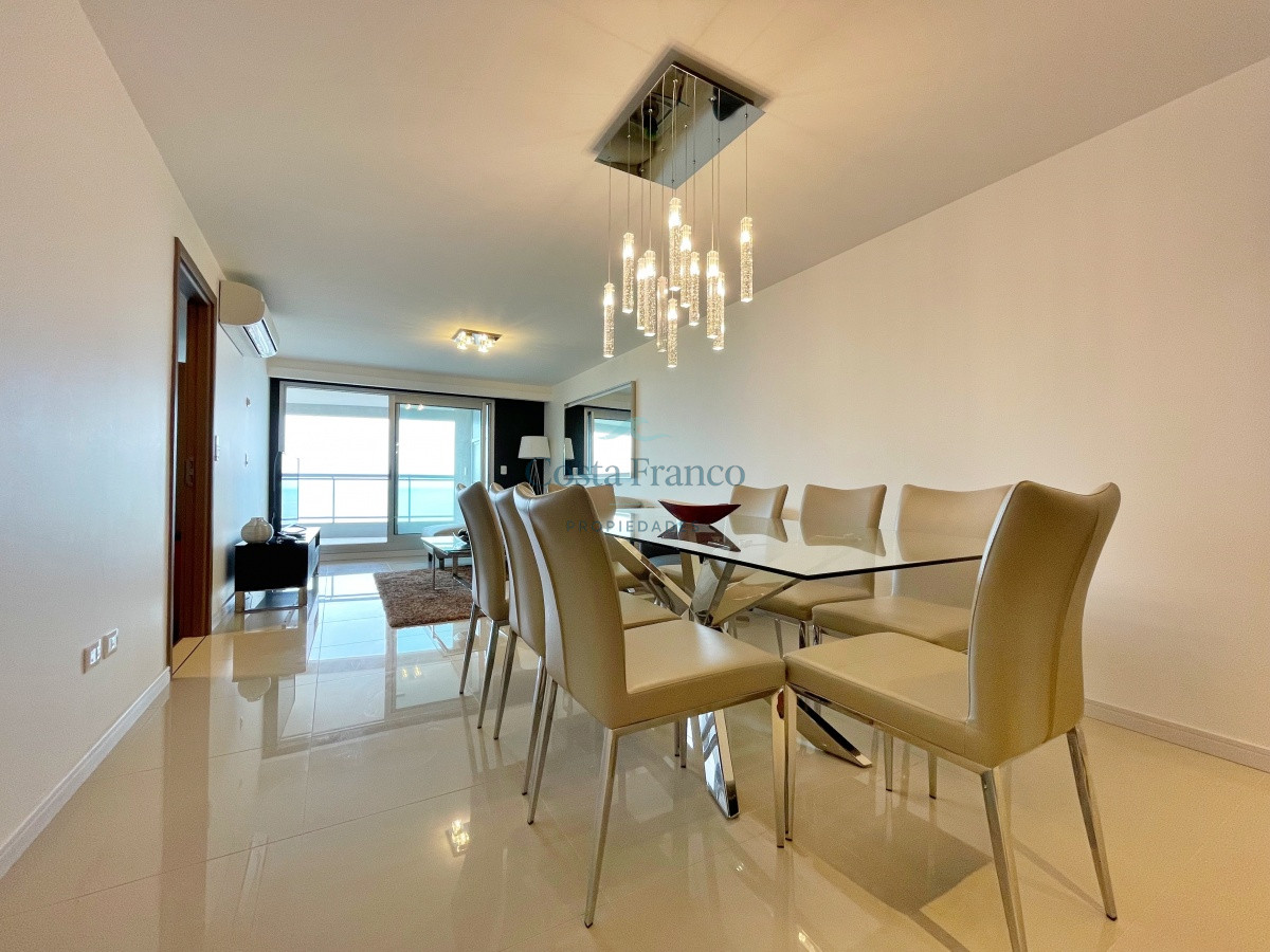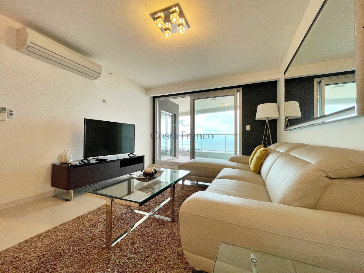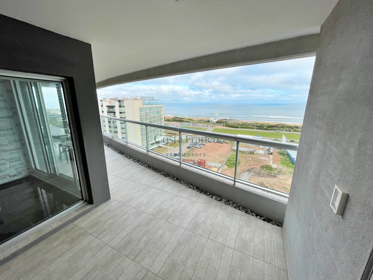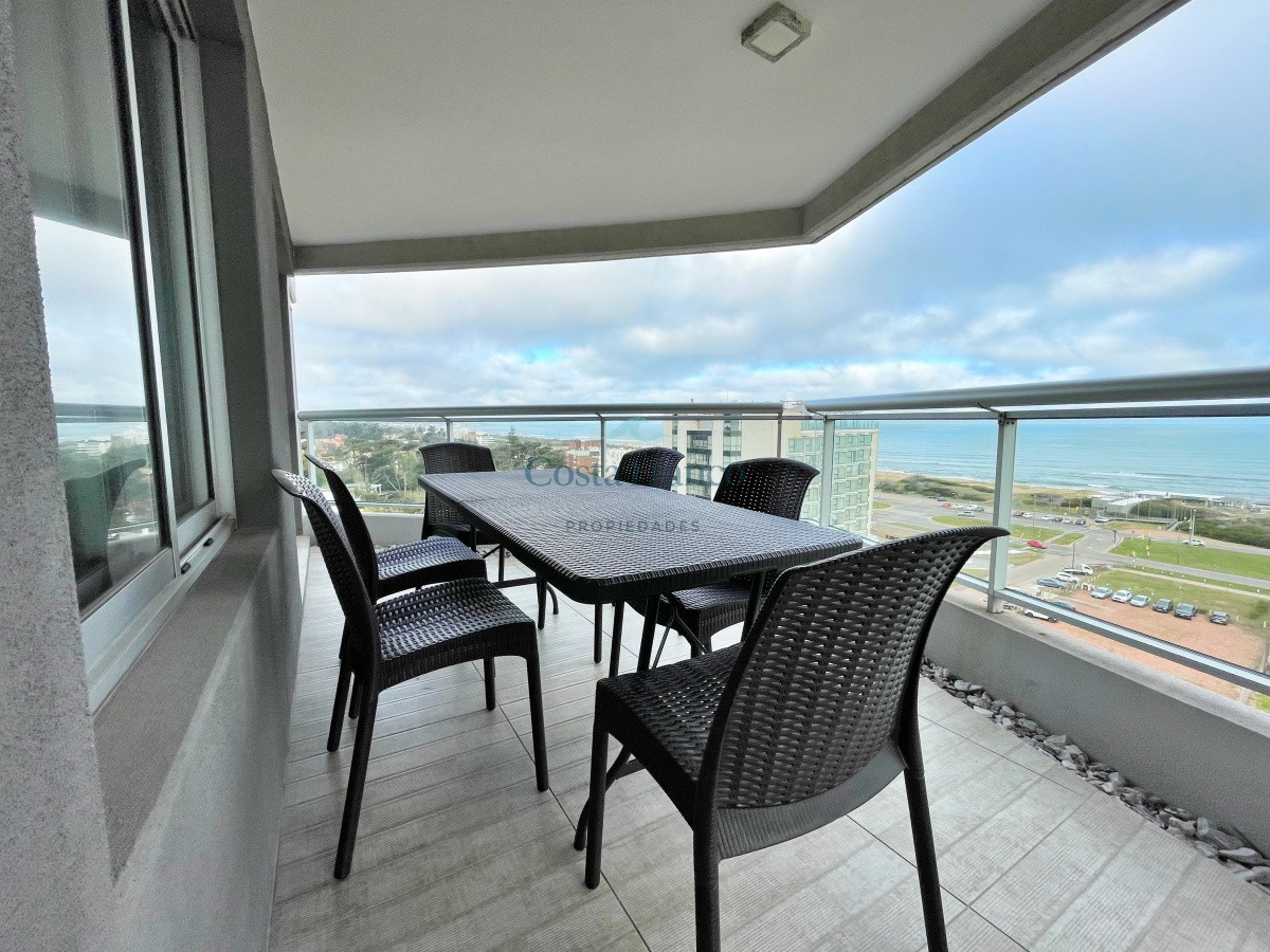 Vista al mar, living comedor, toilette, amplia terraza con parrillero, tres dormitorios, dos baños uno en suite, cocina con comedor diario y garage.