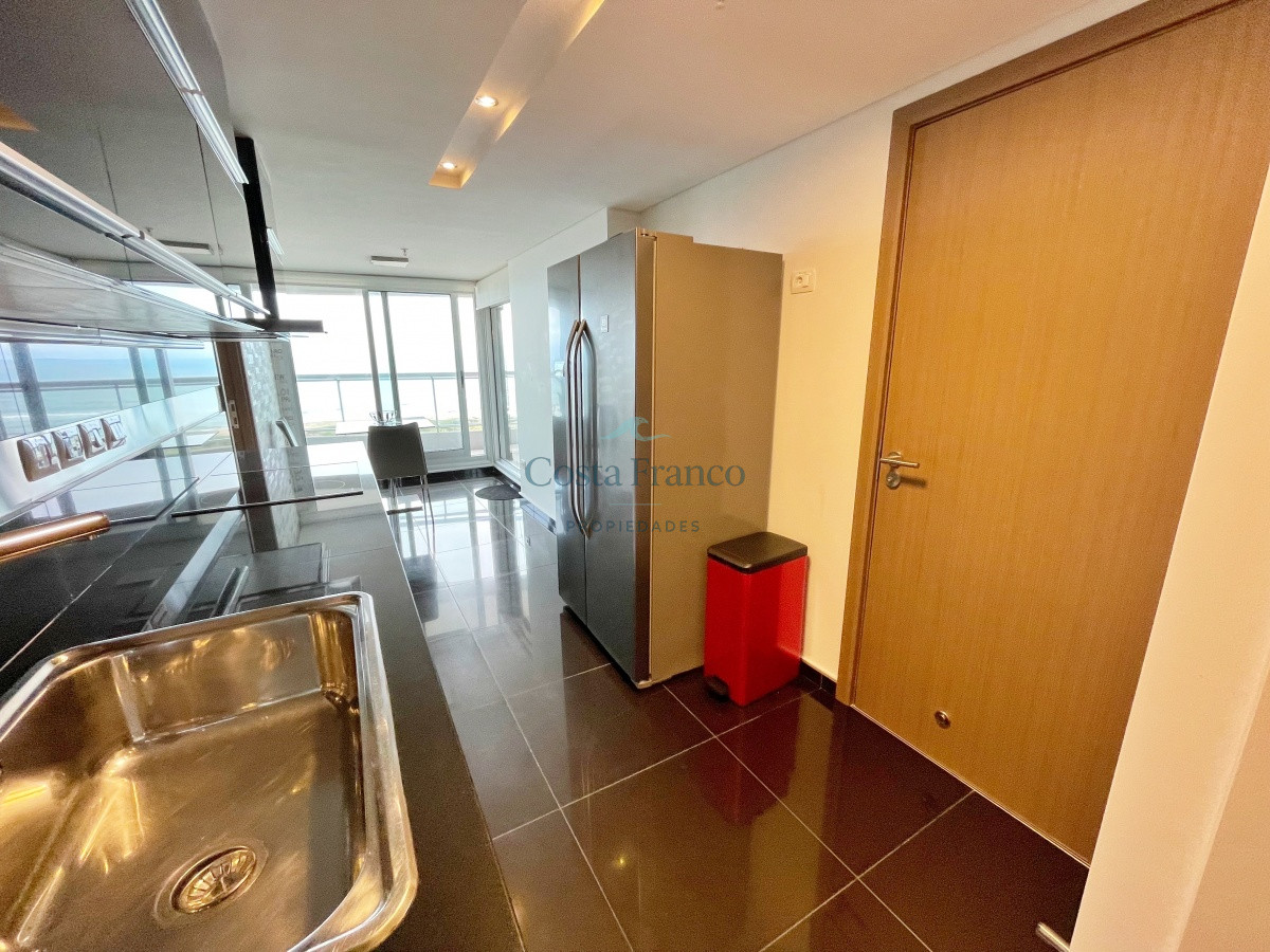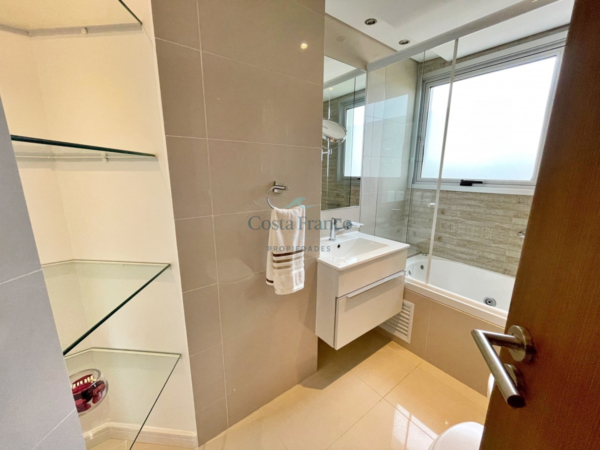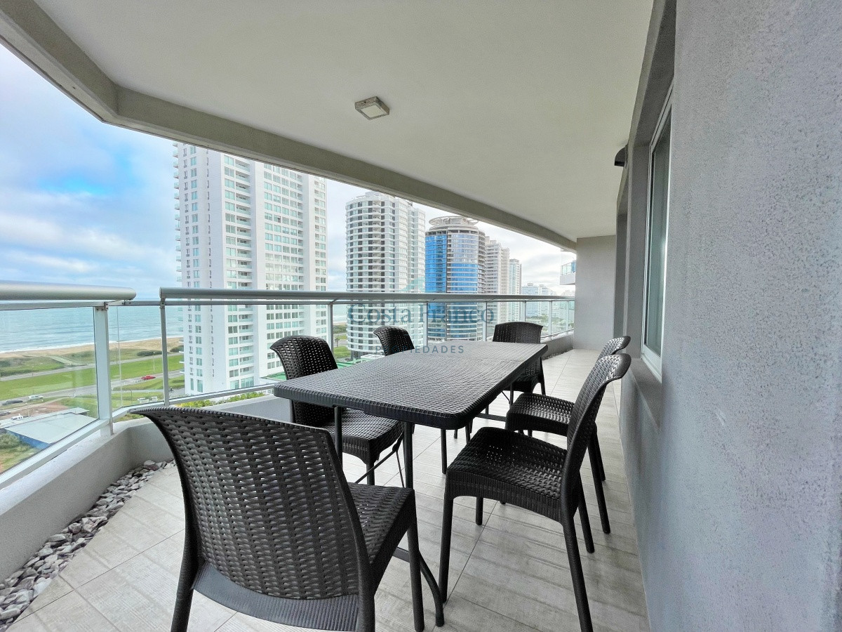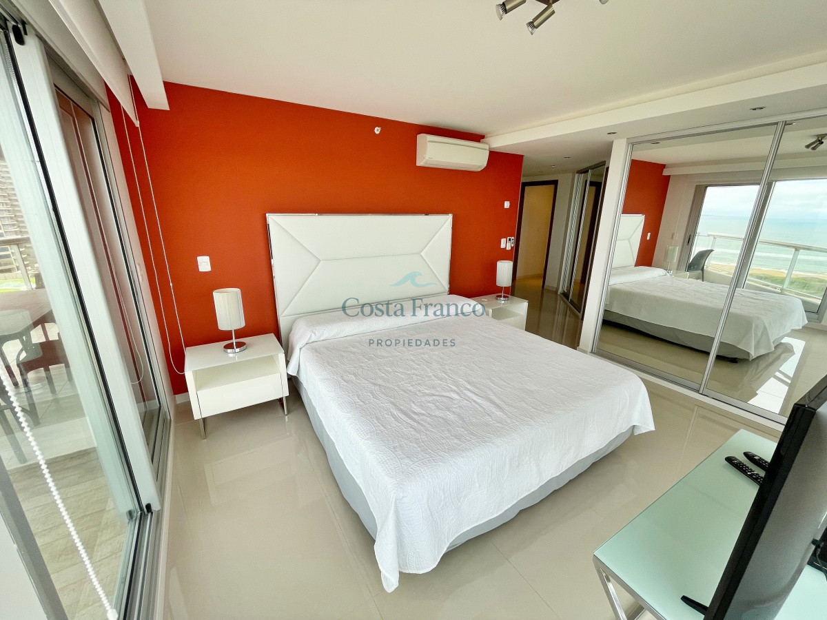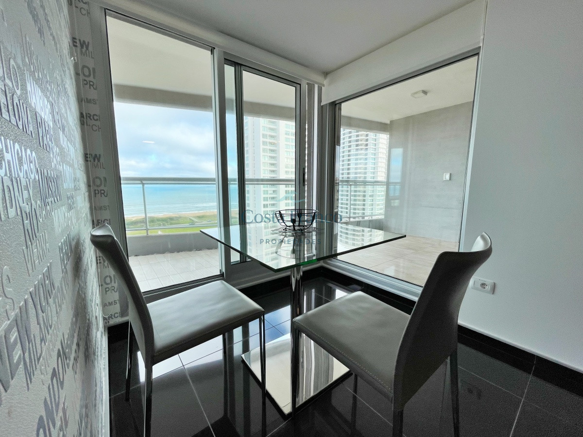 Vista al mar, living comedor, toilette, amplia terraza con parrillero, tres dormitorios, dos baños uno en suite, cocina con comedor diario y garage.