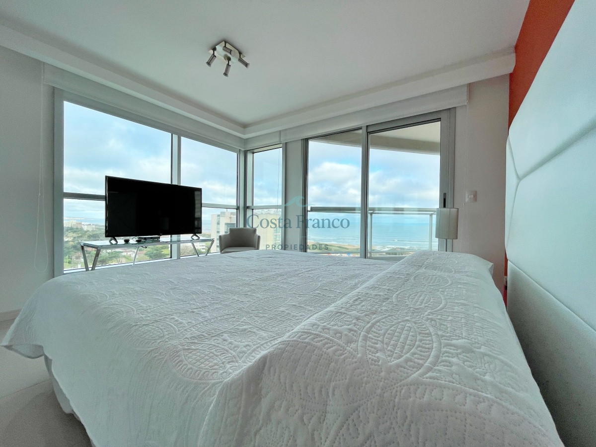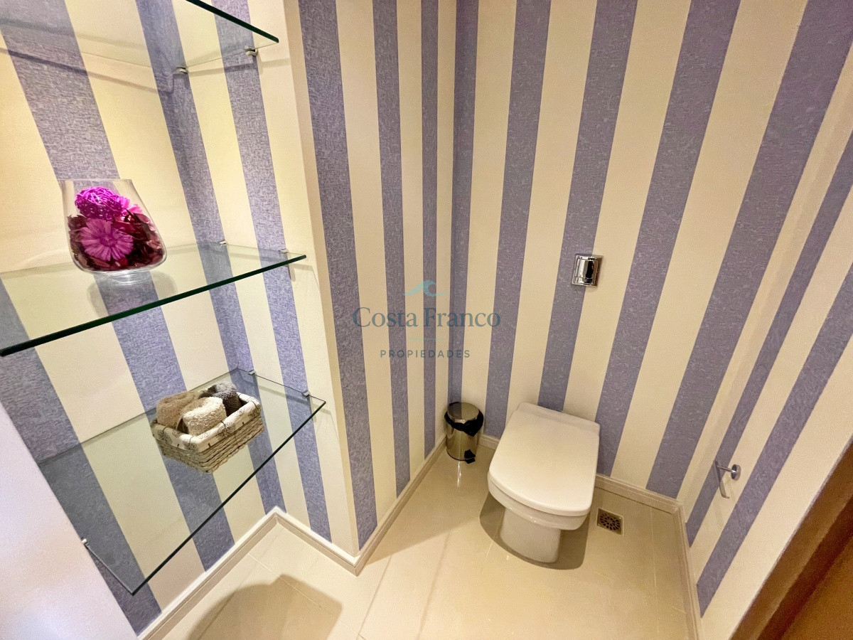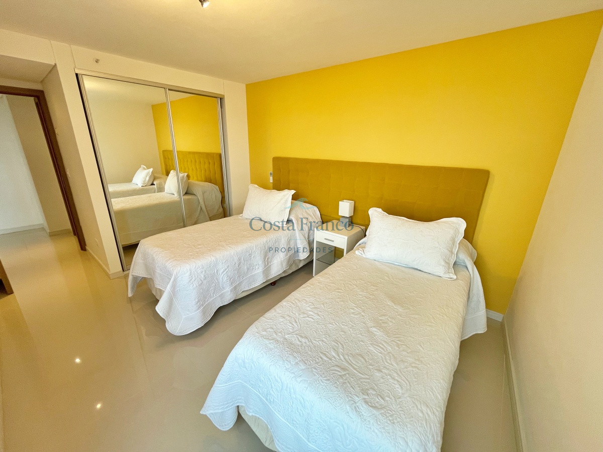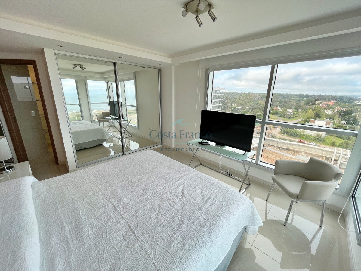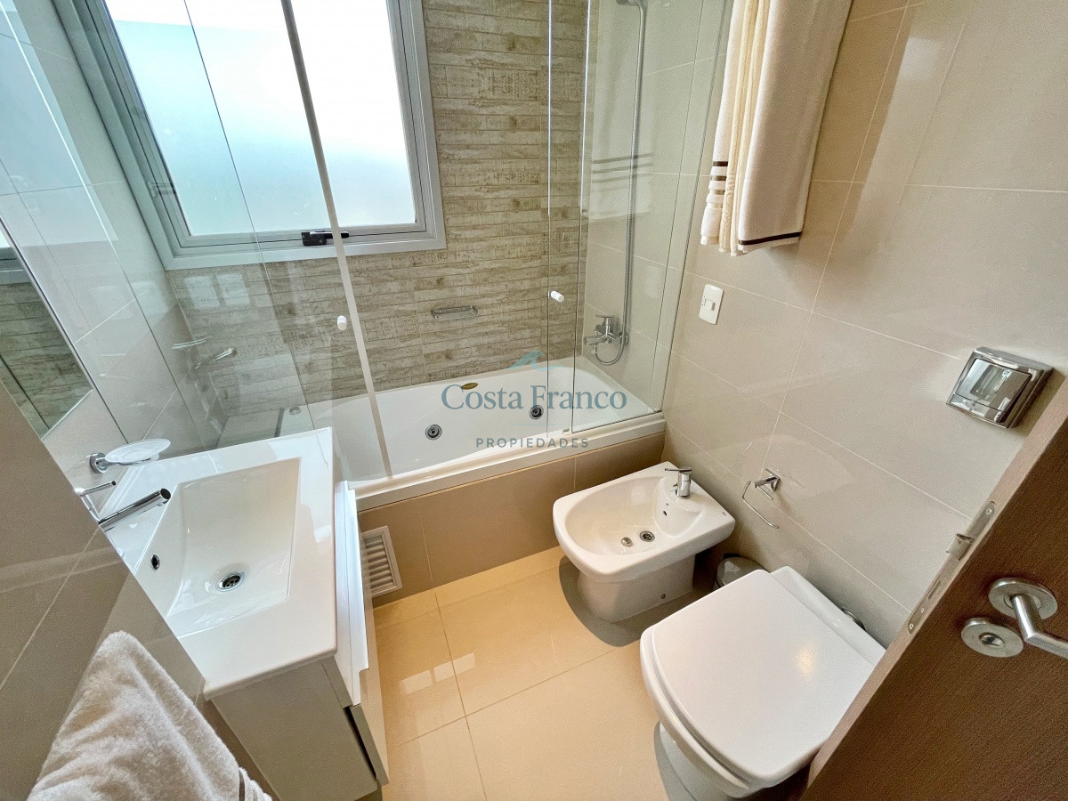 Vista al mar, living comedor, toilette, amplia terraza con parrillero, tres dormitorios, dos baños uno en suite, cocina con comedor diario y garage.