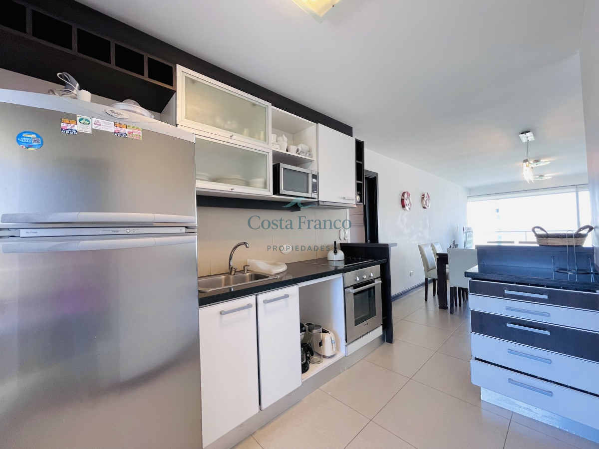 Ambos con aire acondicionado. Living comedor también con salida hacia la terraza y vista al mar. Cocina semi integrada con salida a terraza contra frente que posee parrillero de uso exclusivo y lavadero. Dispone de losa radiante sectorizada.