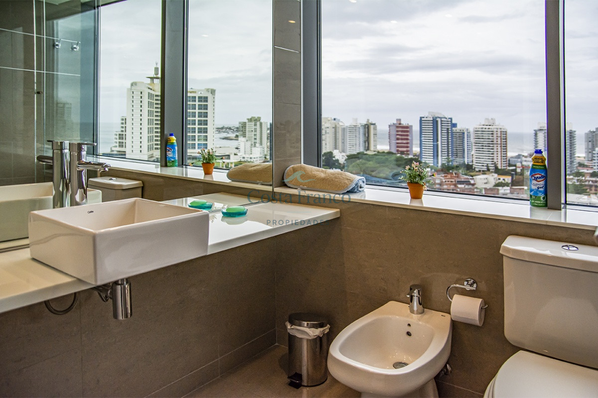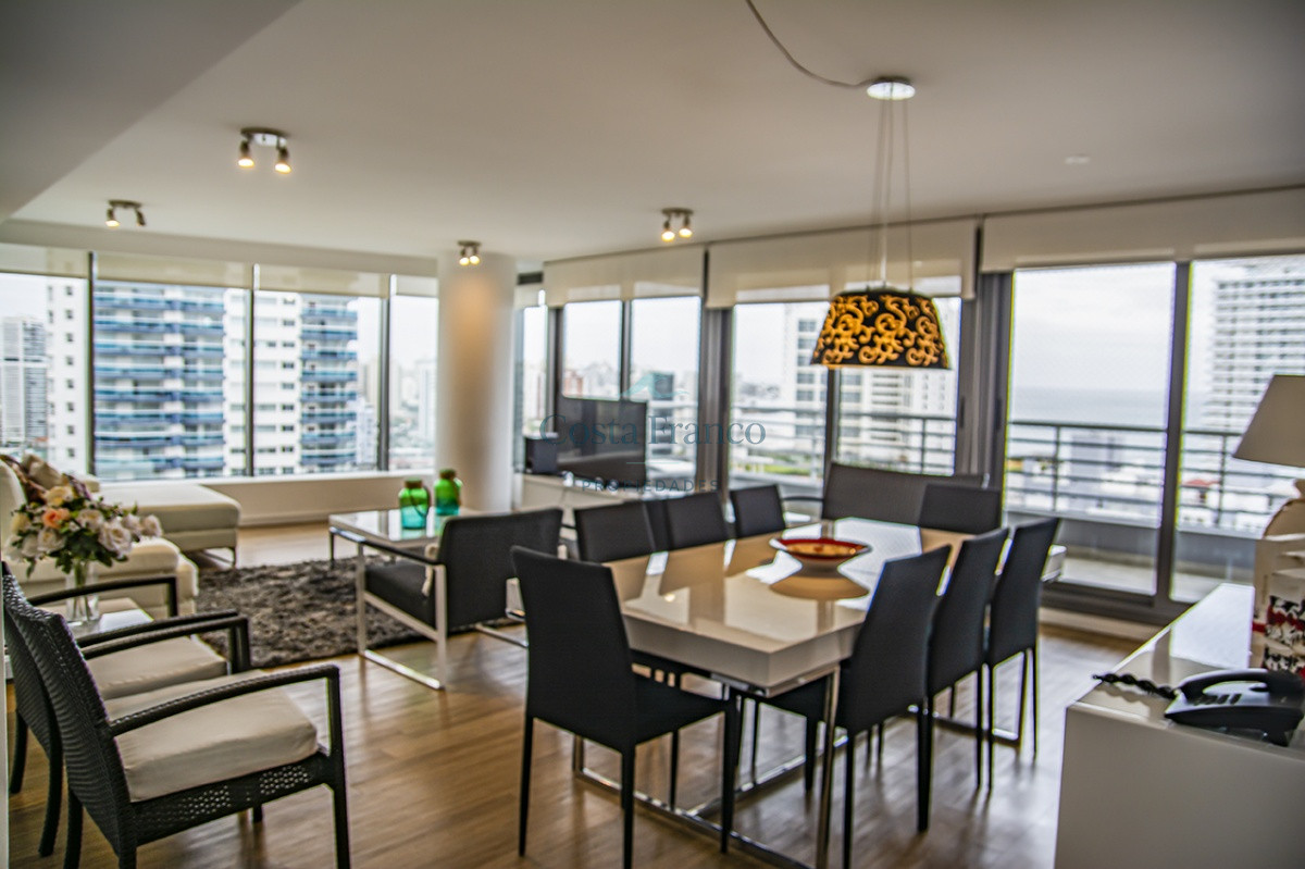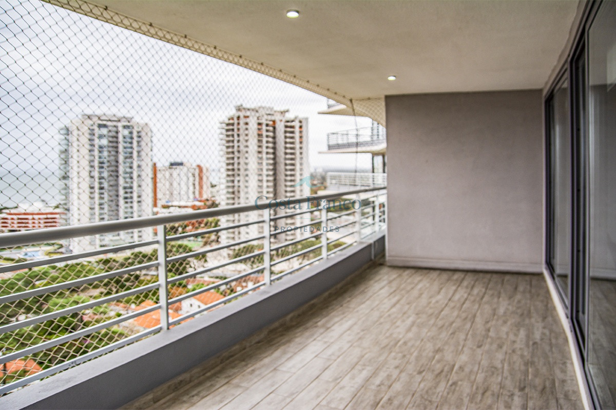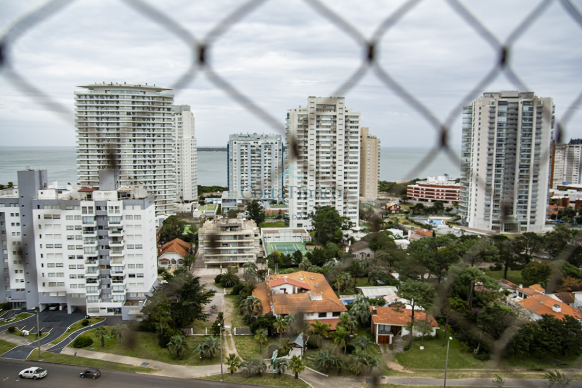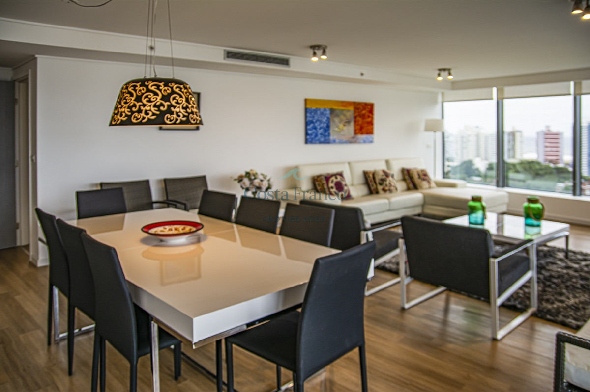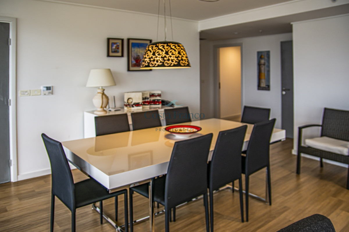 Playa Mansa, piso alto, apto 3 suites, toilette, cocina definida, living comedor, terraza al frente, balcón lavadero y garage.