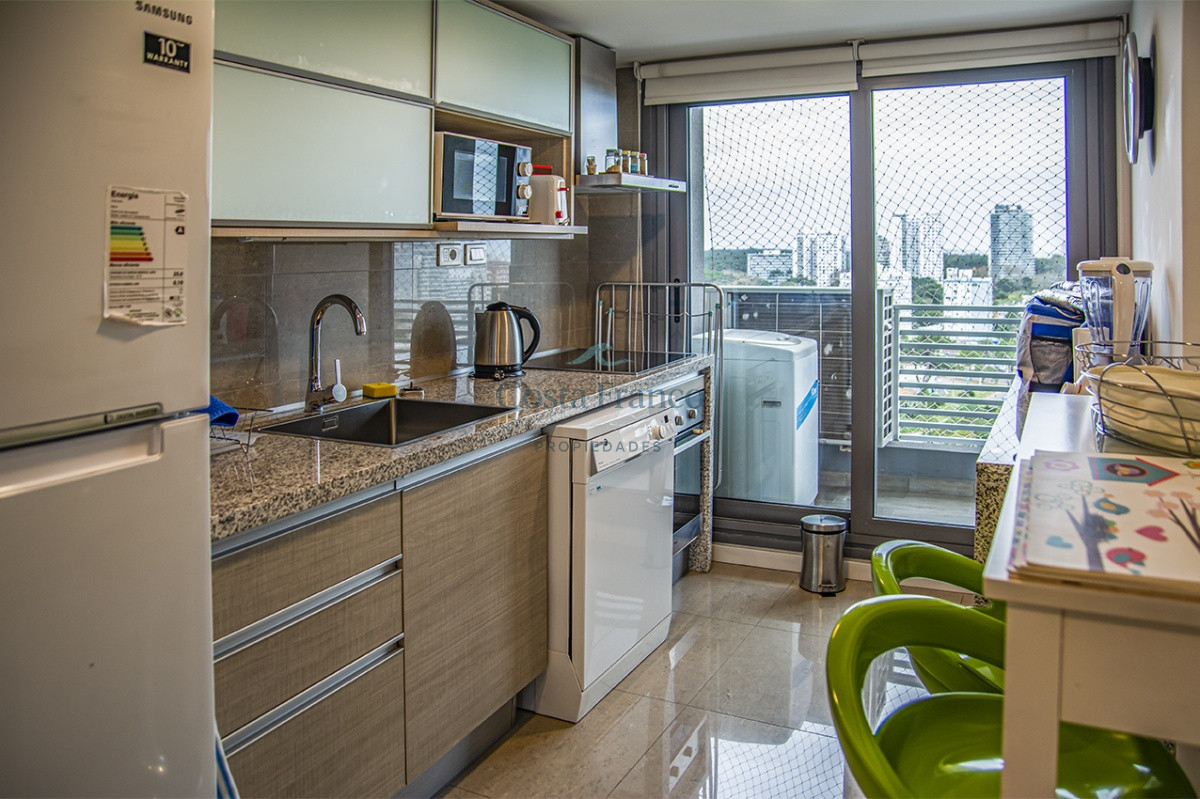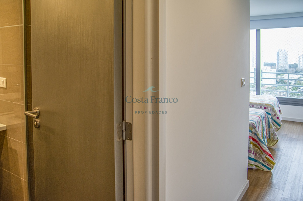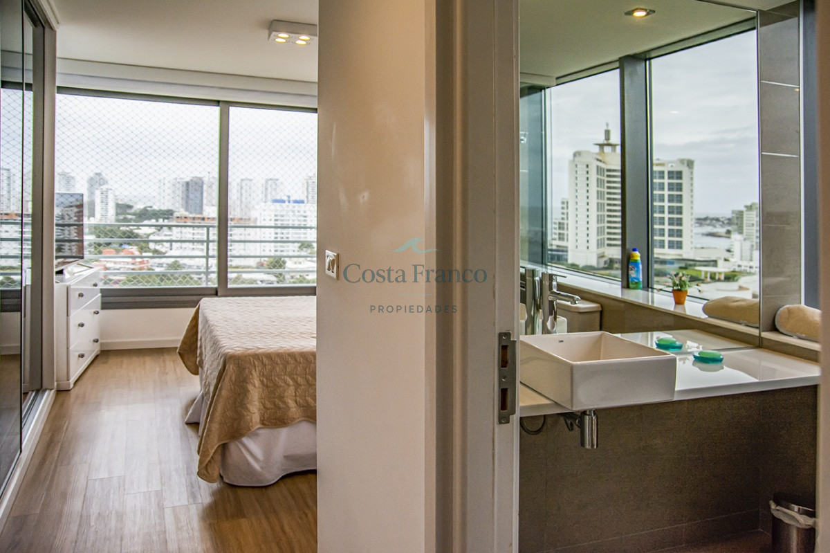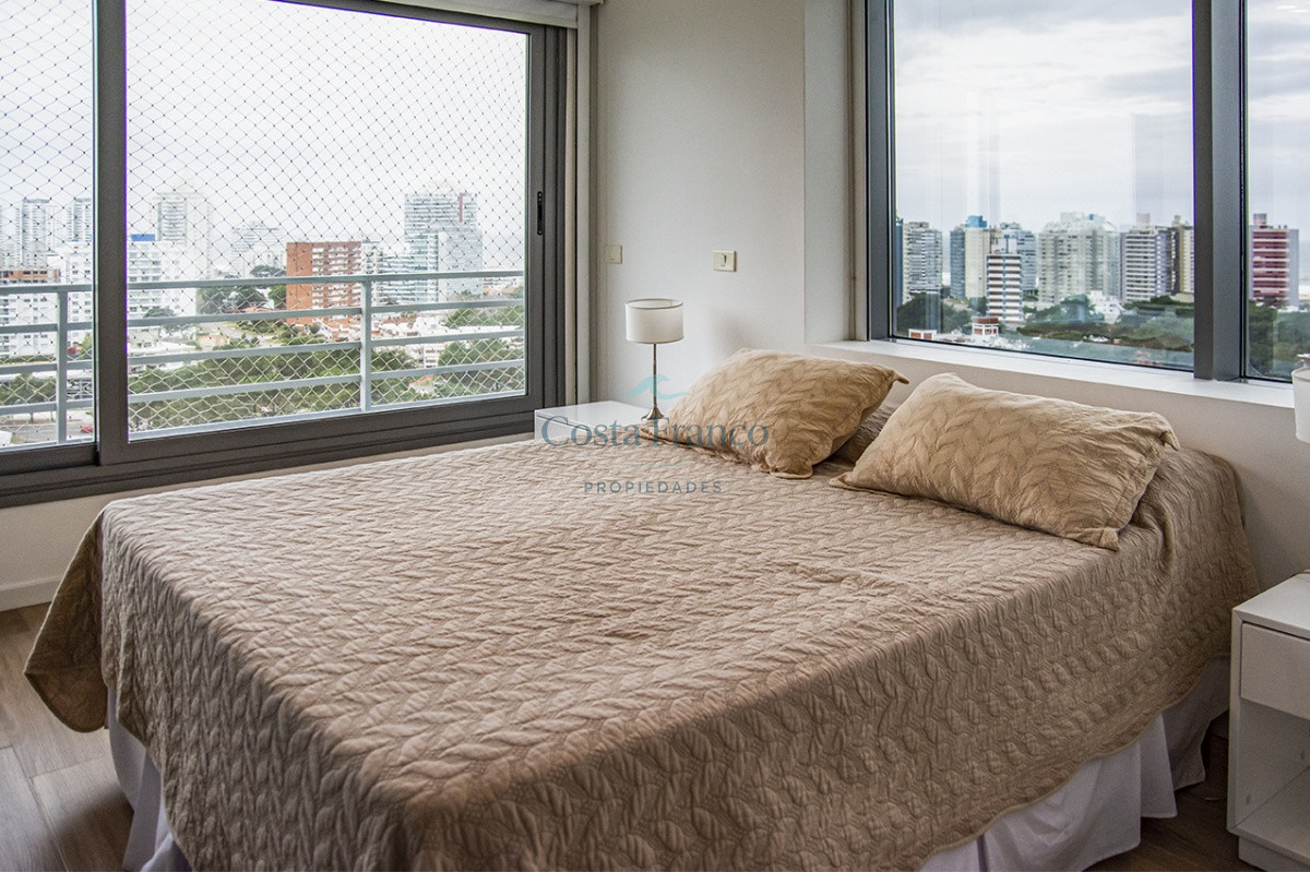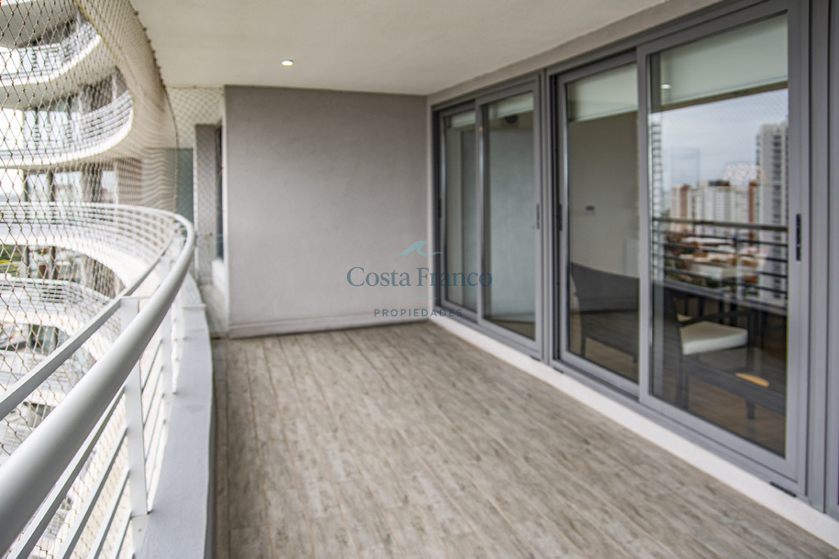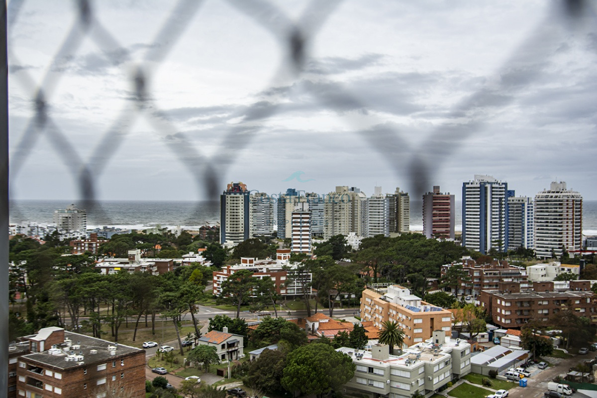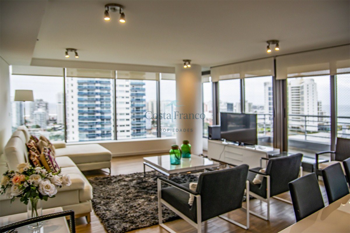 Playa Mansa, piso alto, apto 3 suites, toilette, cocina definida, living comedor, terraza al frente, balcón lavadero y garage.