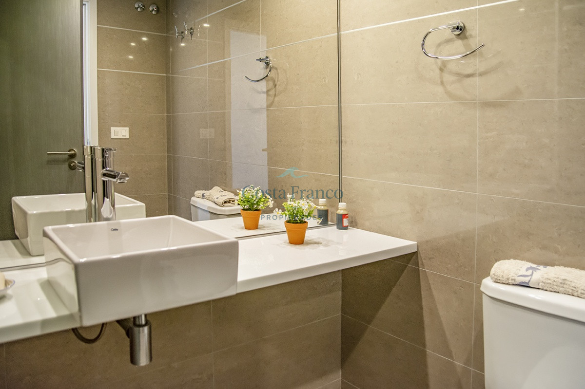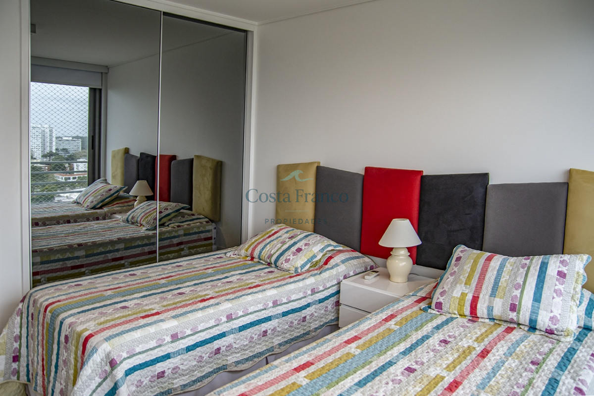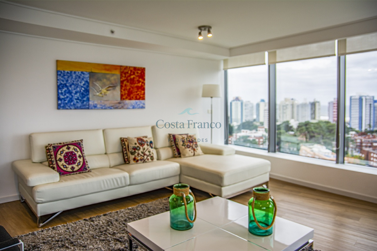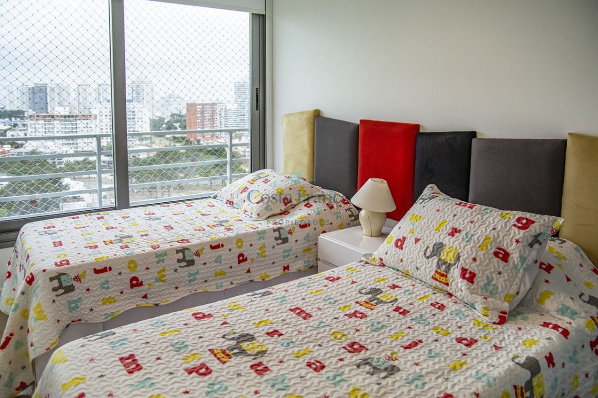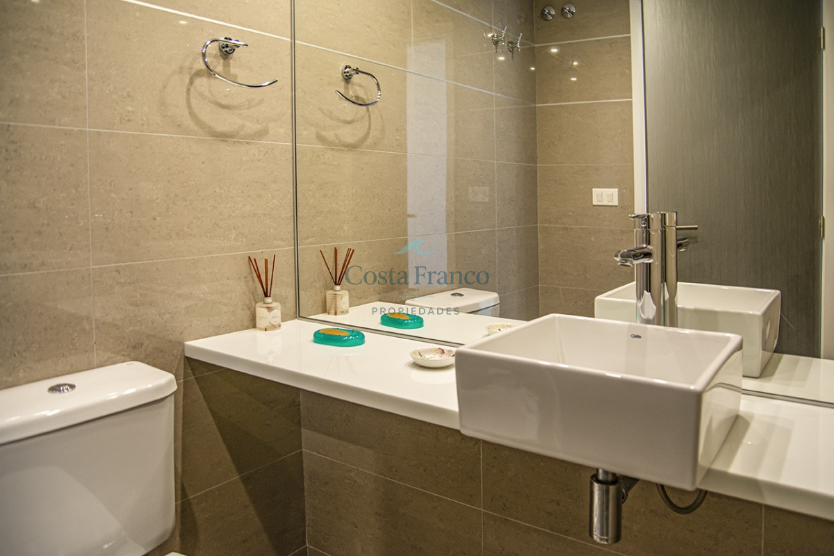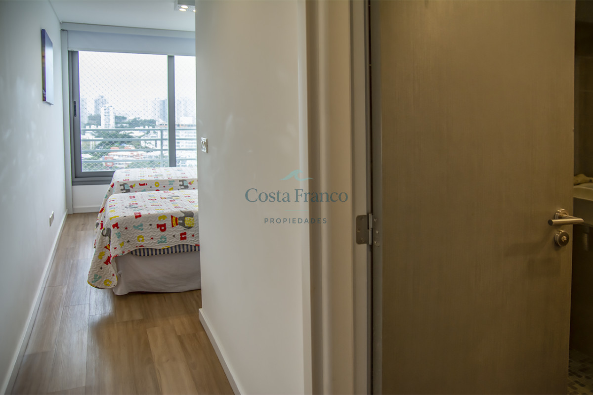 Playa Mansa, piso alto, apto 3 suites, toilette, cocina definida, living comedor, terraza al frente, balcón lavadero y garage.
