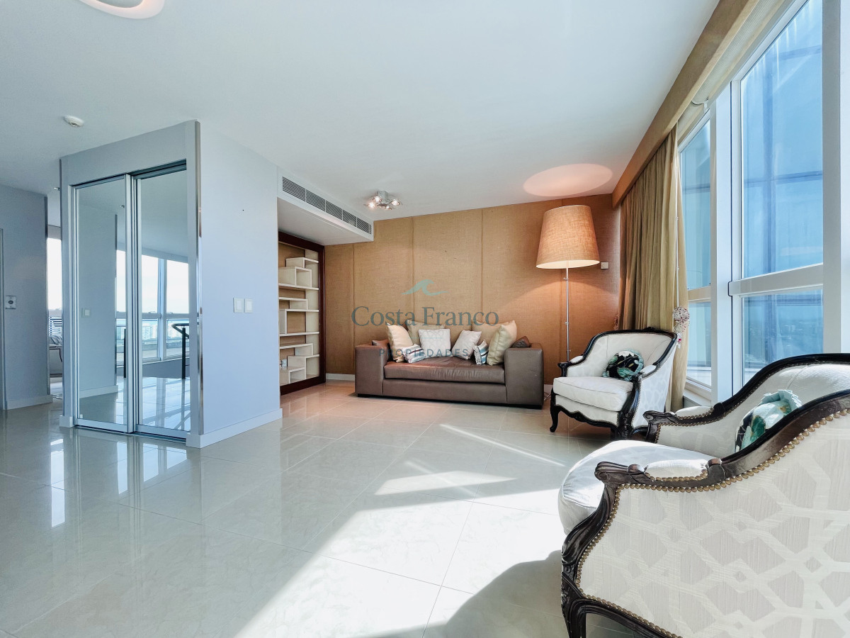 Amplio living comedor de doble altura con grandes ventanales que proporcionan una iluminación natural espectacular, con salida al balcón y vista al mar.