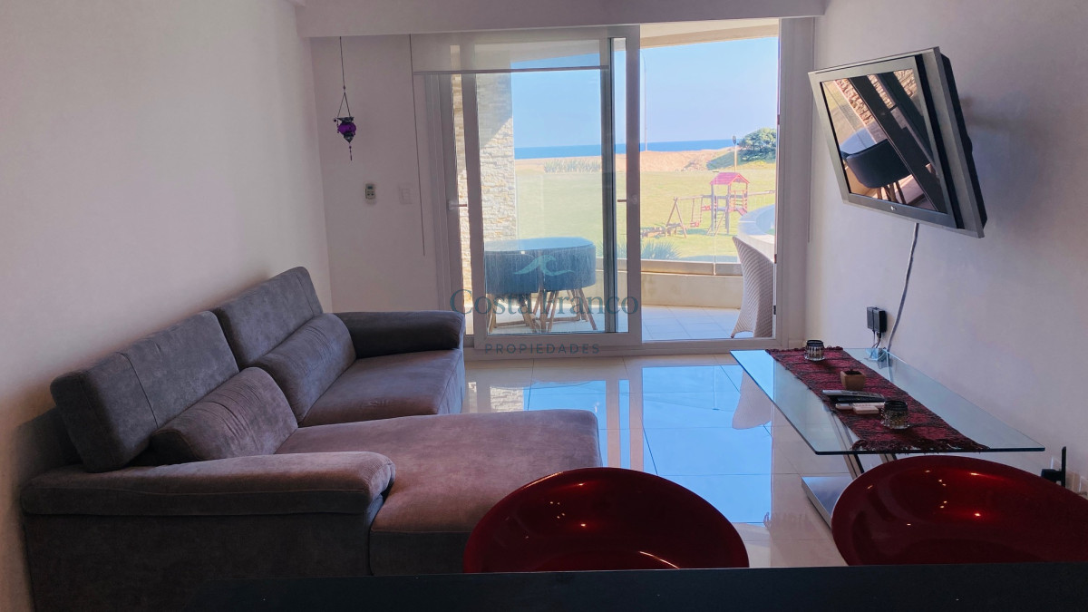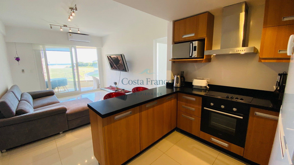 El departamento: 1 dormitorio, 1 baño, living-comedor y cocina, terraza al frente. Vista al mar y al atardecer. Tiene aire acondicionado en living y dormitorio, ventanales con doble vidrio, placares.